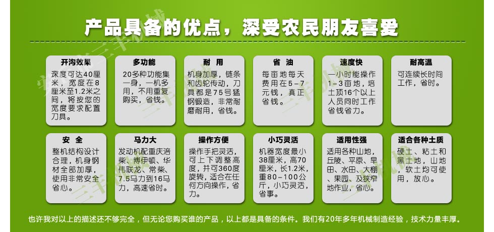 我公司本著以人為本,起壟機,大型開溝機,葡萄埋藤機質量為先,市場在變,誠信不變”的經營理念以誠信、合作、發(fā)展、創(chuàng)新為宗旨。本著“誠信、優(yōu)質”的質量方針及中國制造、銷往五洲的奮斗目標。以雄...